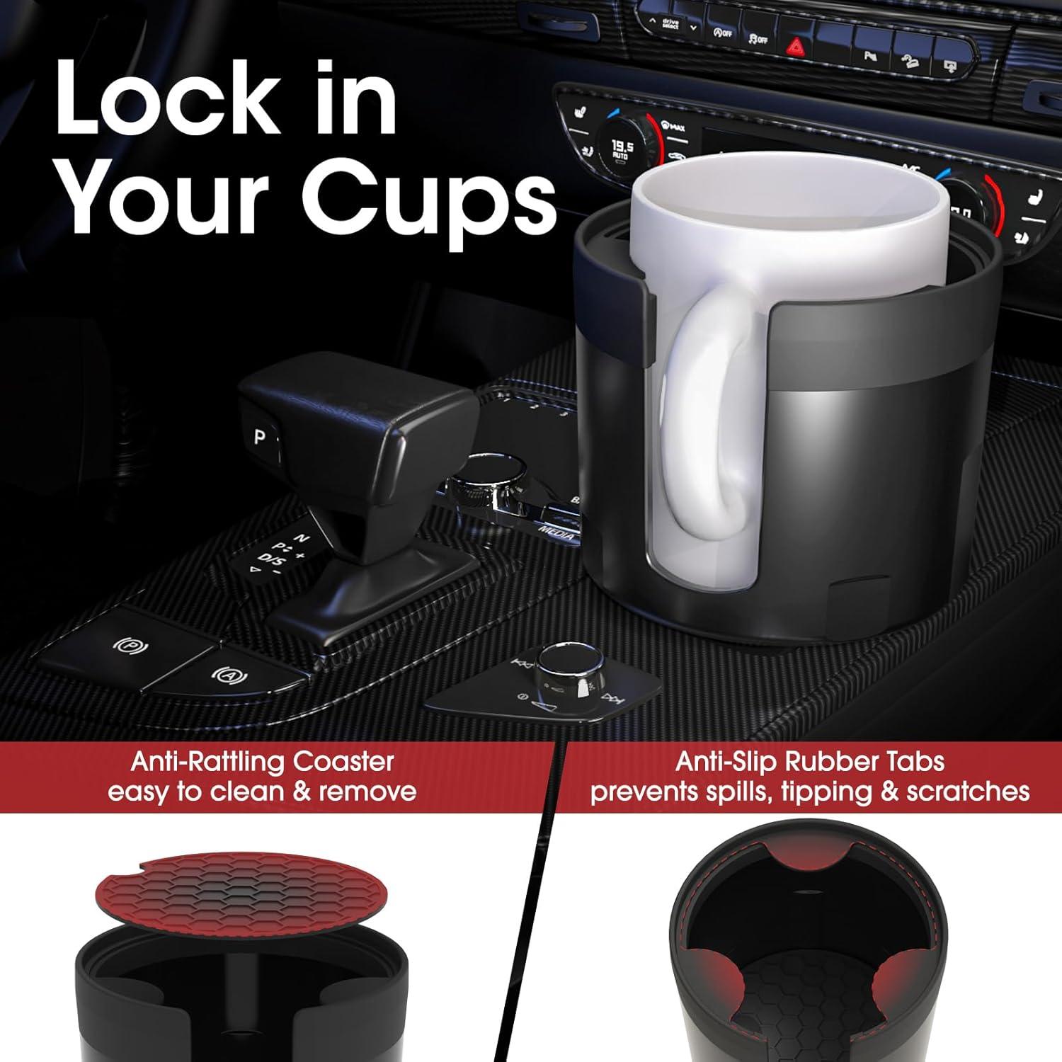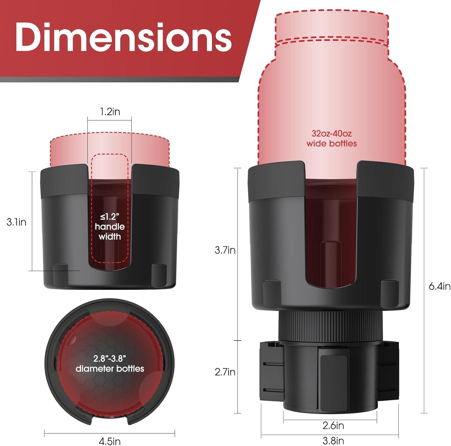 FOR LARGE BOTTLES & WIDE CUPS: With a universal size, this is a cup holder extender for car that is compatible with Yeti Rambler (20, 26, and 30 oz), Hydro Flasks (32 and 40 oz), Nalgenes (30, 32, 38, and 48 oz), drinks between 3.4''-3.8'' W container, and most 32-40 oz bottles. (Note: it does not fit Rambler 14oz mug.)